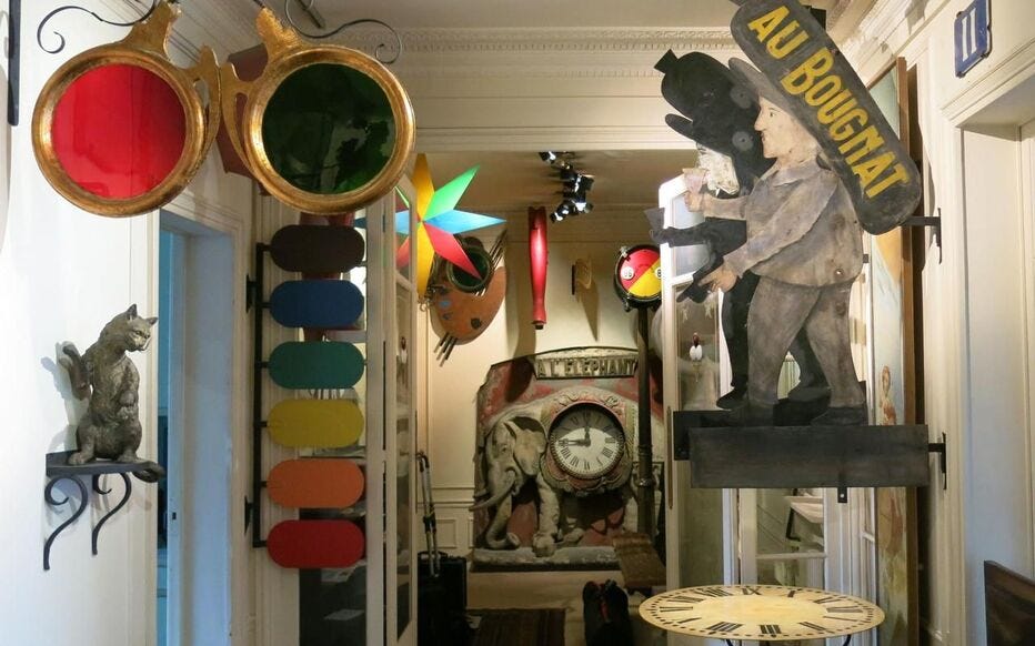 Starting in the 1960s as Paris saw a flurry of municipal modernization, Roxane Debuisson (1927-2018) began collecting cast-aside Parisian construction detritus on her daily walks: “rating plates, bench marks, pieces of bridges, tree corsets, street signs, fountains, gallows, Métro seats, mailboxes, and some seventy thousand commercial invoices.” As Lauren Collins of the New Yorker tells it, a visitor to her apartment “could walk through corridors hung thick with shop signs—a cobbler’s boot, a glove-maker’s hand, a six-and-a-half-foot-tall pair of scissors, two gilded snails—into the dining room, where an entire wall was given over to a set of enamel-and-glass panels from a defunct pâtisserie.” (First discovered in “The Case for Lunch,” New Yorker, July 21, 2025).